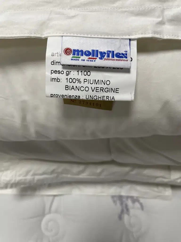 Одеяла изготовлены исключительно из натуральных материалов, и являются гипоаллергенными, что подтверждено также сертификатом Европейской пухо-перовой ассоциации – Assopiuma Gold®. Пух класса 1 «премиум» (лёгкий, упругий, не требует «взбивания»), наивысшая степень очистки и обеззараживания. Эта маркировка свидетельствует о том, что пух прошел высокотемпературную сушку и не содержит аллергенов, а процедура обработки пуха соответствует европейскому стандарту.
